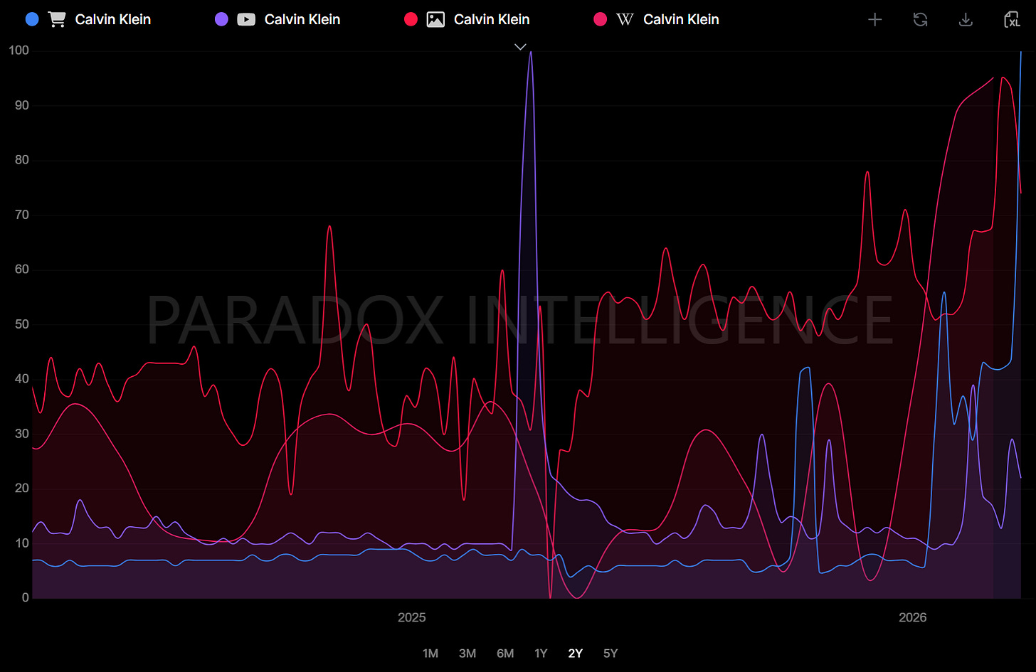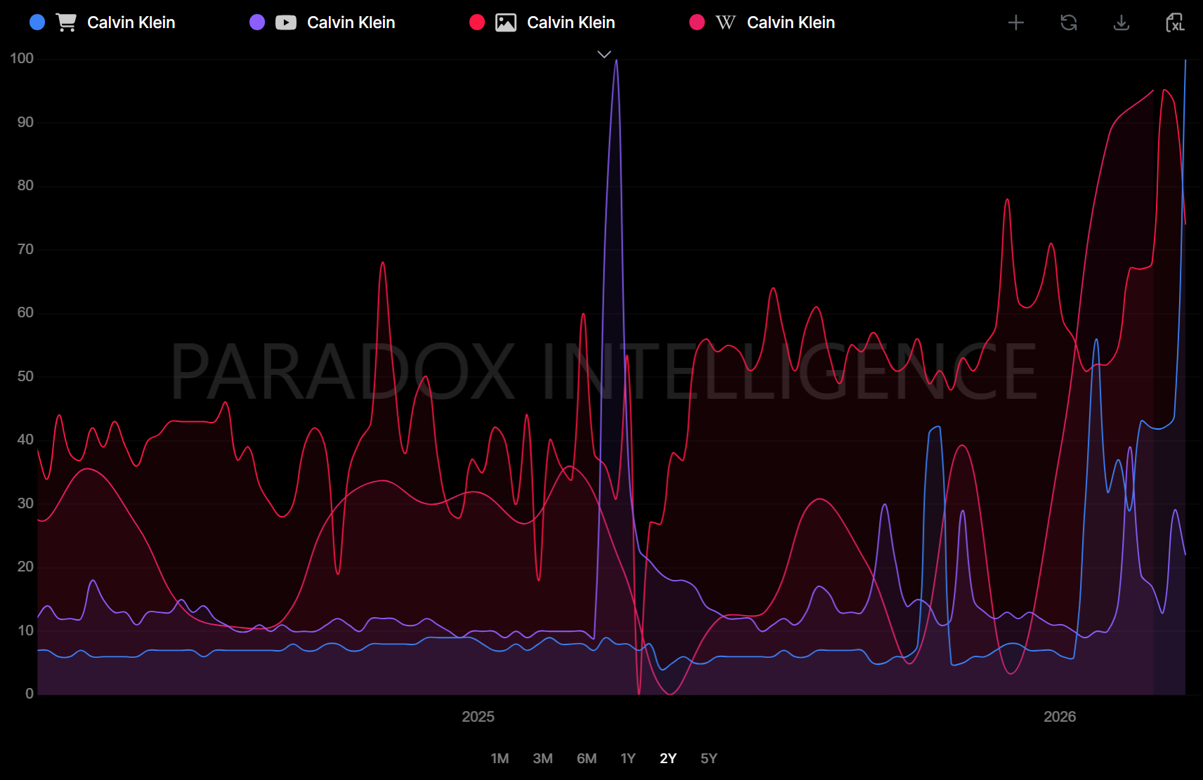 The divergence between steady general search growth and the extreme Shopping spike is the key signal. Awareness of Calvin Klein as a brand is relatively stable; purchase intent is surging. That pattern is consistent with a demand pull, not a marketing awareness lift.