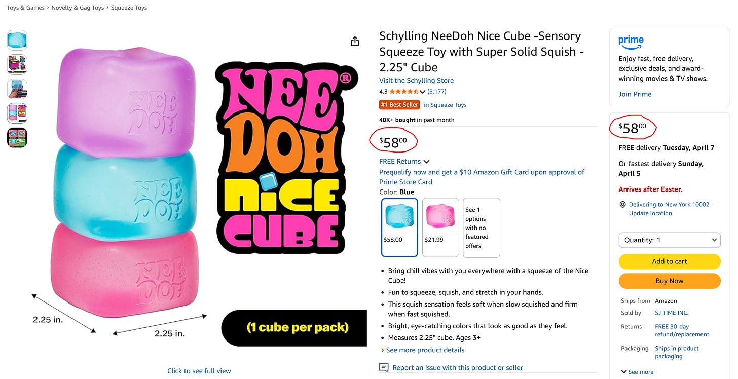 On December 14, 2025, the Needoh Nice Cube was priced at $10.99 on Amazon. By March 30, 2026, according to price tracking data across 434 days of history, the same listing reached an all-time high of $28.00. That is a 155% price increase in roughly three months, against an average tracked price of $10.61 over the full period. The pink and purple variants are selling for $32.00 and $28.25 respectively at the same date. The manufacturer’s suggested retail price is $9.99. Third-party sellers are charging nearly three times the retail price and still selling out.