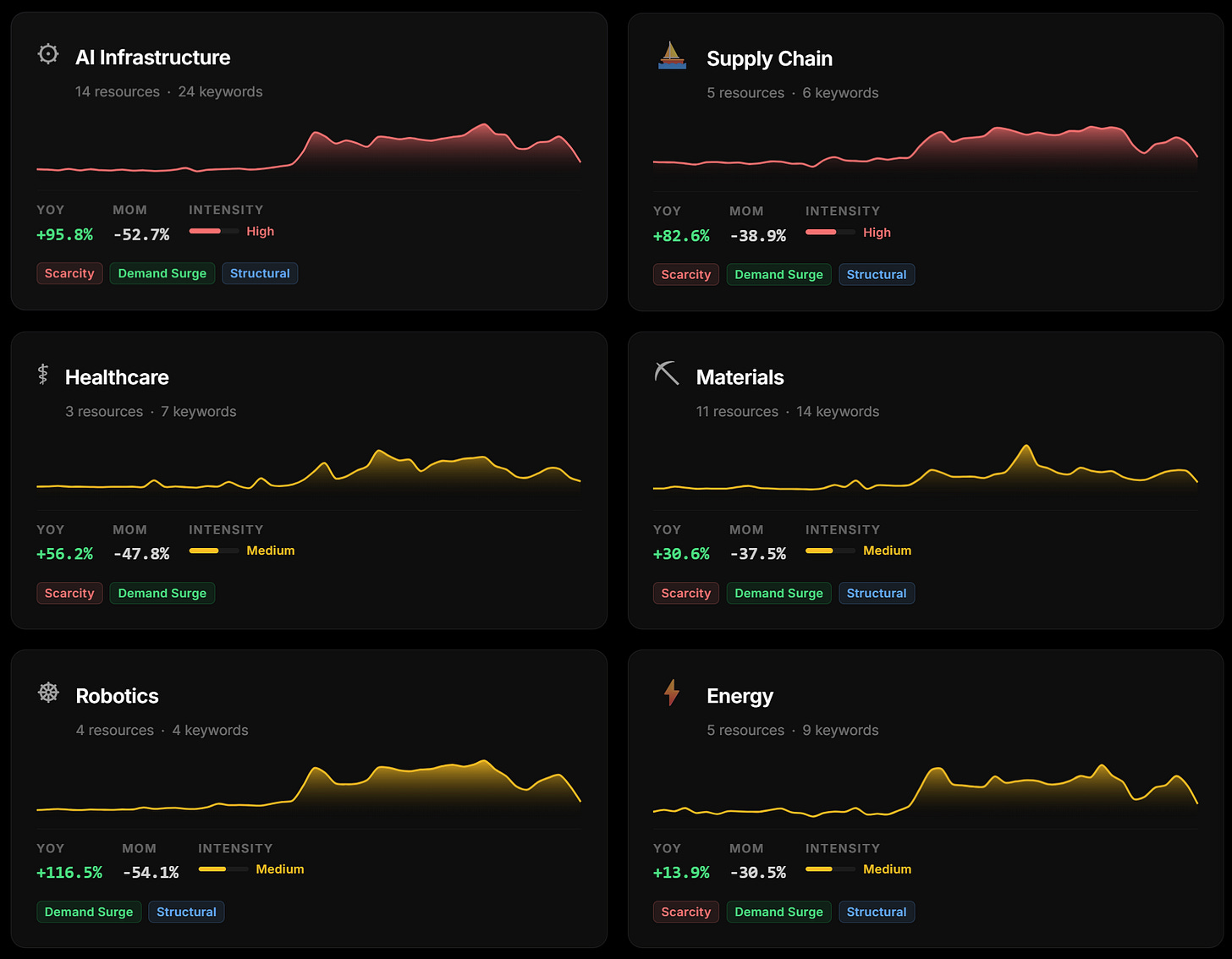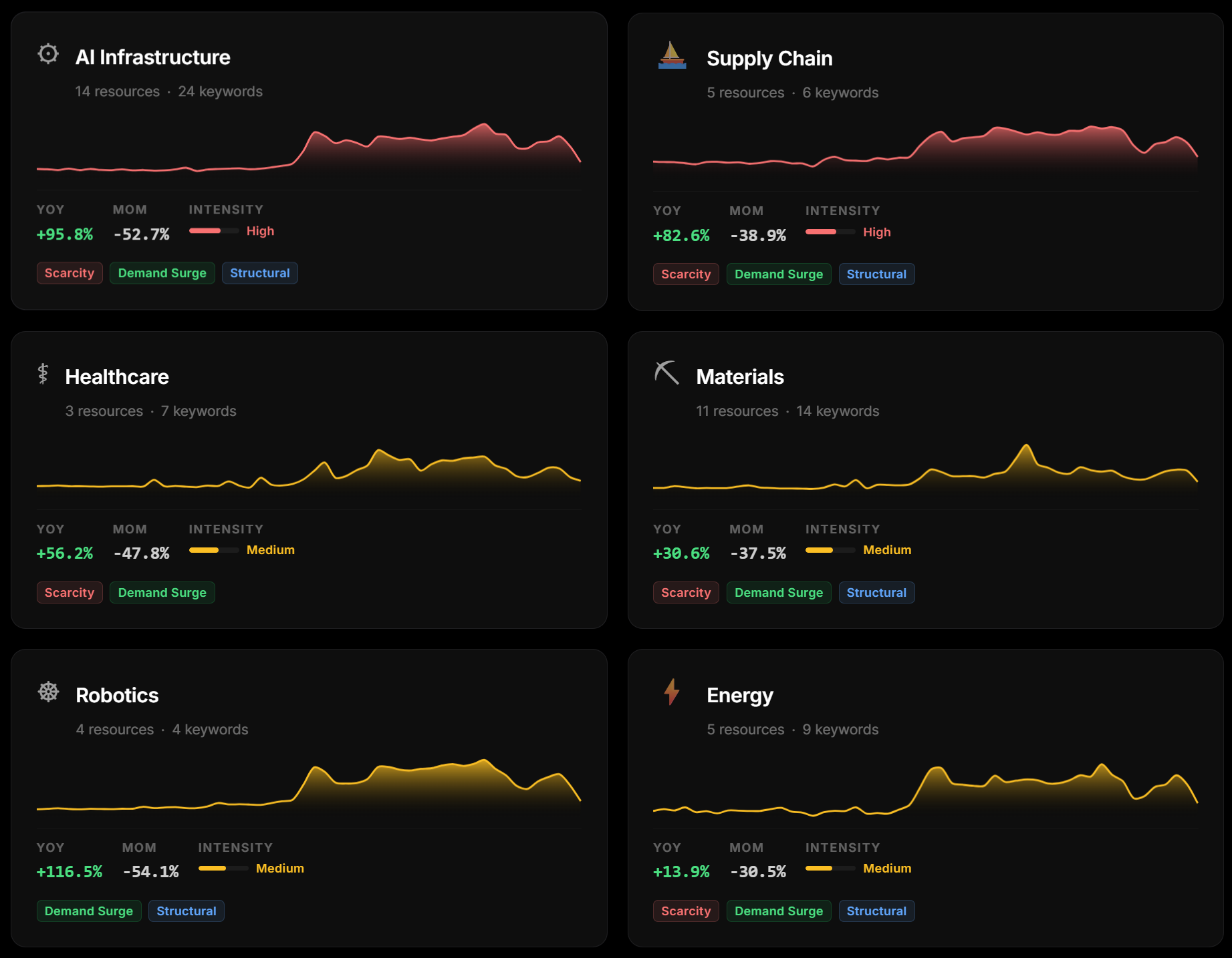 Categories are high-level themes: AI Infrastructure, Materials, Energy, Healthcare, Supply Chain, Defense, Labor, Consumer Tech, Housing, Robotics, and others. Each category groups many resources and keywords. The category view gives you a quick read on which themes are heating up (intensity, year-over-year and month-over-month growth) and a sparkline of trend over time. You can navigate by category when you want to start from a theme and drill down.