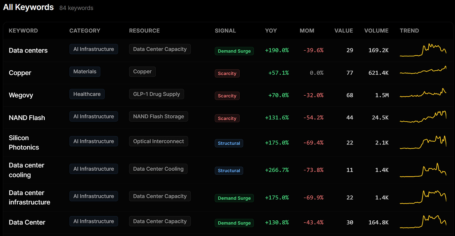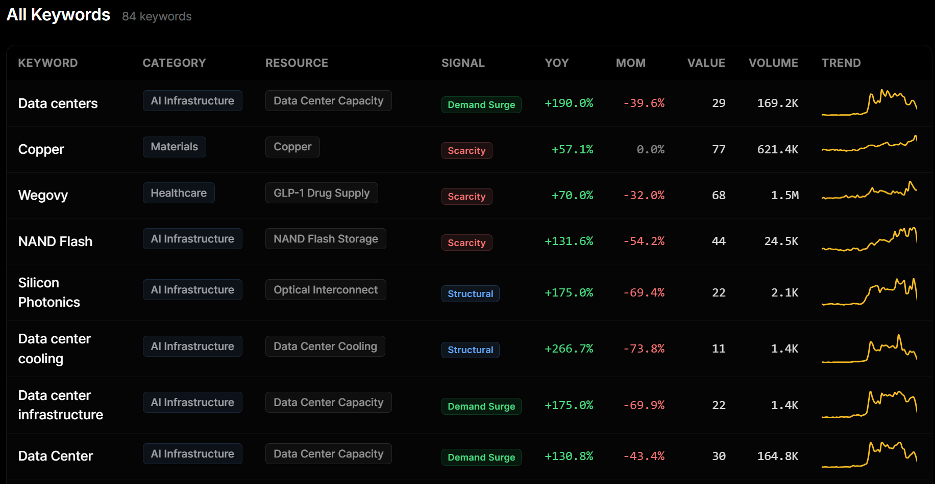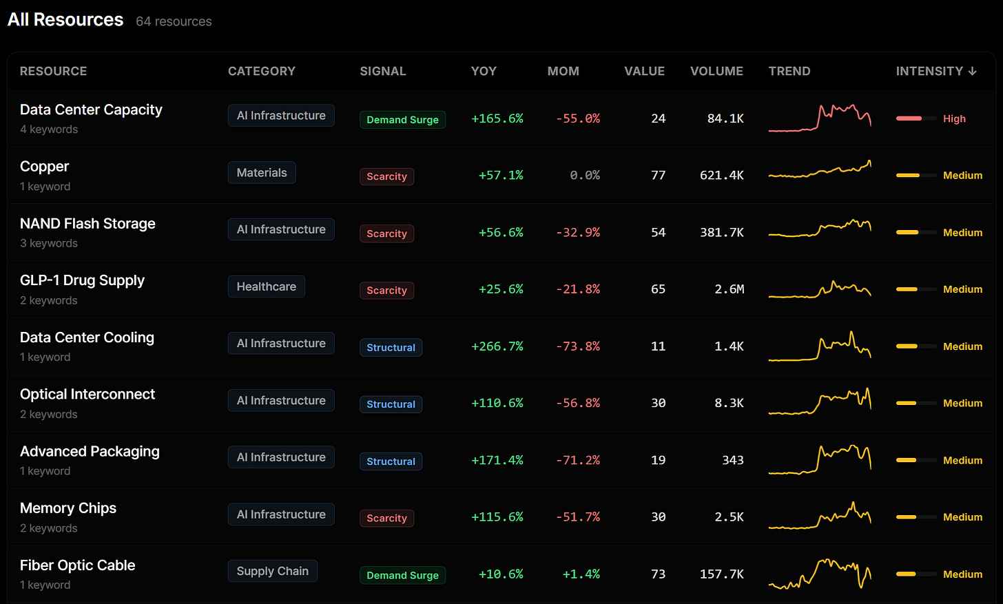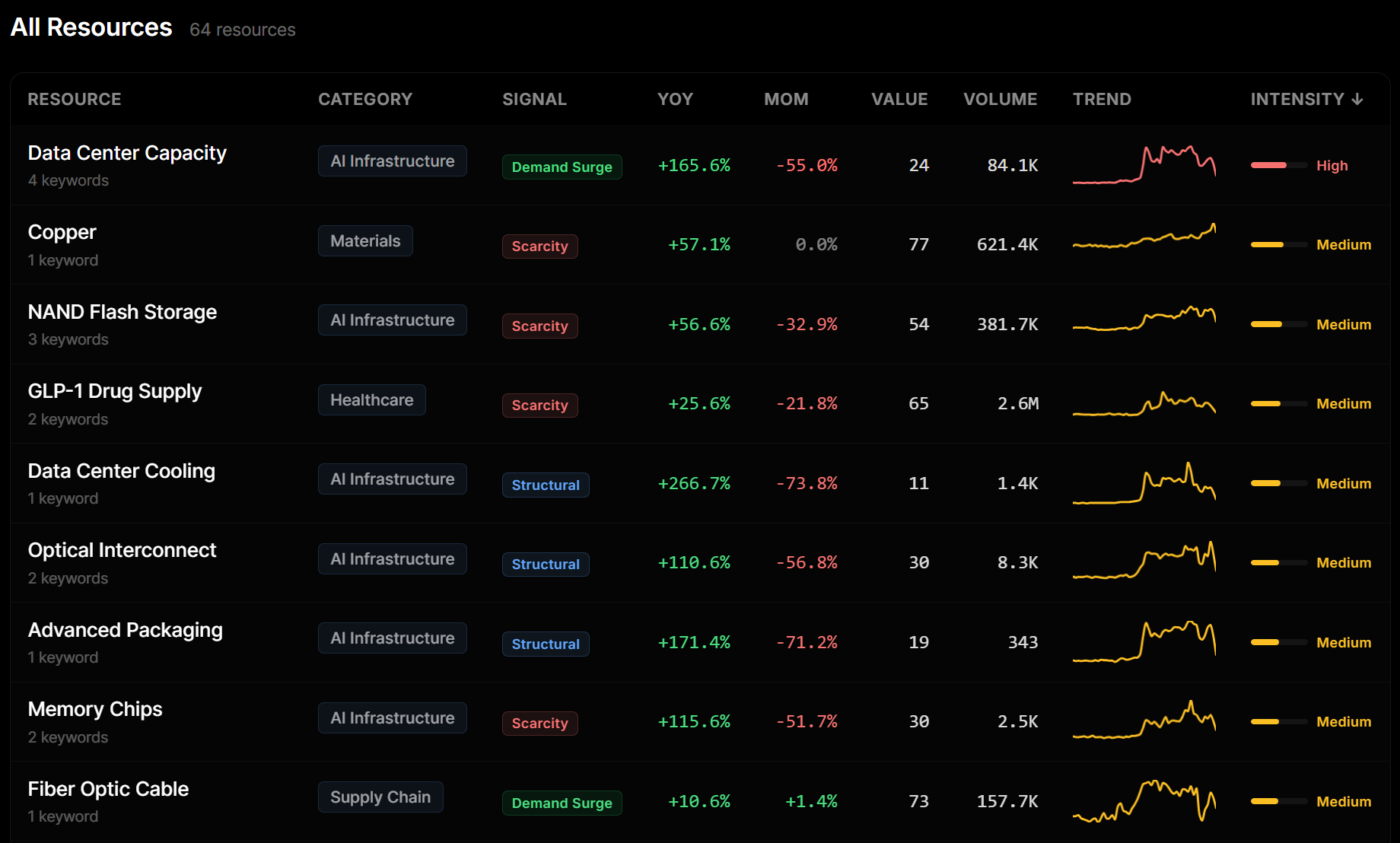 A resource is a specific bottleneck or structural topic within a category: for example, a particular commodity, component, or constraint. Each resource has a set of keywords we track and aggregate metrics (growth, volume, intensity) across them. The resource list under a category lets you sort by intensity, YoY, MoM, or volume so you can see which specific bottlenecks are moving most. Clicking a resource takes you to the keyword-level detail and time series.
