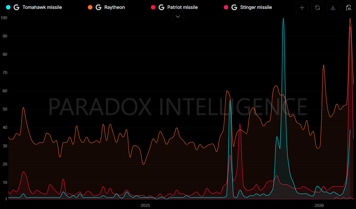 Paradox Intelligence tracks normalized search volume, news intensity, and multi-platform engagement data across digital signals. When public attention concentrates on a specific product, brand, or system at scale, and that signal persists across multiple platforms simultaneously, it typically reflects a meaningful change in the real world. In the case of RTX, the signal maps directly to the company’s highest-margin, longest-cycle revenue lines.