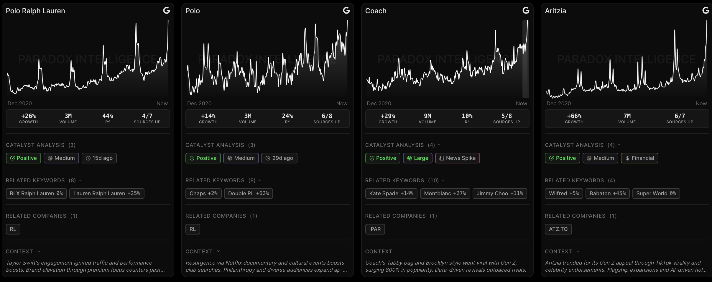 RL: “Ralph Lauren” searches up 28% YoY - Global partnerships bolstering aspirational appeal highlight e-commerce scalability, with potential for sustained wholesale demand.
