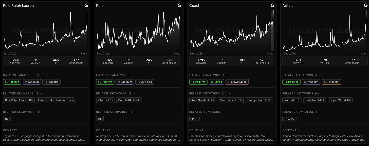 RL: “Double RL” searches up 62% YoY - Heritage collections tapping nostalgia trends indicate premium segment strength, supporting wholesale channel recovery and margin expansion.
