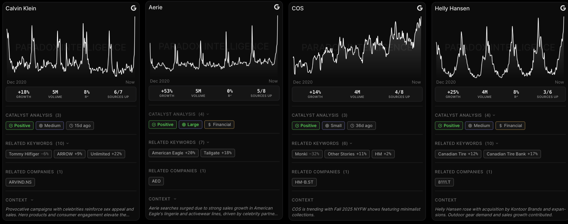 AEO: “Todd Snyder” searches up 62% YoY - Upscale menswear integration post-acquisition signals portfolio elevation, suggesting improved average transaction values and e-commerce penetration.