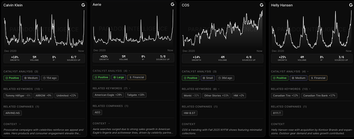 ATZ: “Babaton” searches up 45% YoY - Tailored womenswear demand amid hybrid work shifts points to subcategory outperformance, with implications for boutique productivity and inventory efficiency.