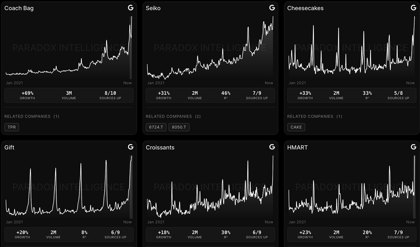 $CAKE (Cheesecakes): “Cheesecakes” up 33% YoY - Flavor innovations like cinnamon variants signal menu refresh opportunities for Cheesecake Factory, driving foot traffic in casual dining.